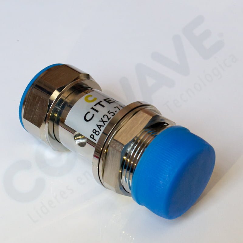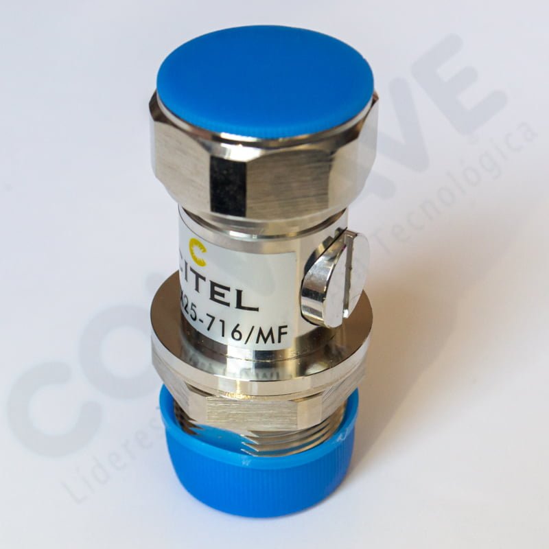 Protección de descargas tipo 1 para coaxial marca CITEL, para operar entre 0 Hz y 3.5 GHz, perdidas menores a 0.2 db, tecnología descargador de gas. Conector 716 Macho/Hembra.